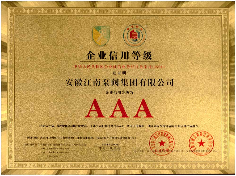 安徽江南泵閥集團(tuán)有限公司榮獲3A企業(yè)信用等級(jí)證書,主營:氟塑料泵,不銹鋼泵,耐腐蝕化工泵,品質(zhì)卓越,行業(yè)領(lǐng)跑企業(yè),科研生產(chǎn)型企業(yè)20年鑄就行業(yè)輝煌!...