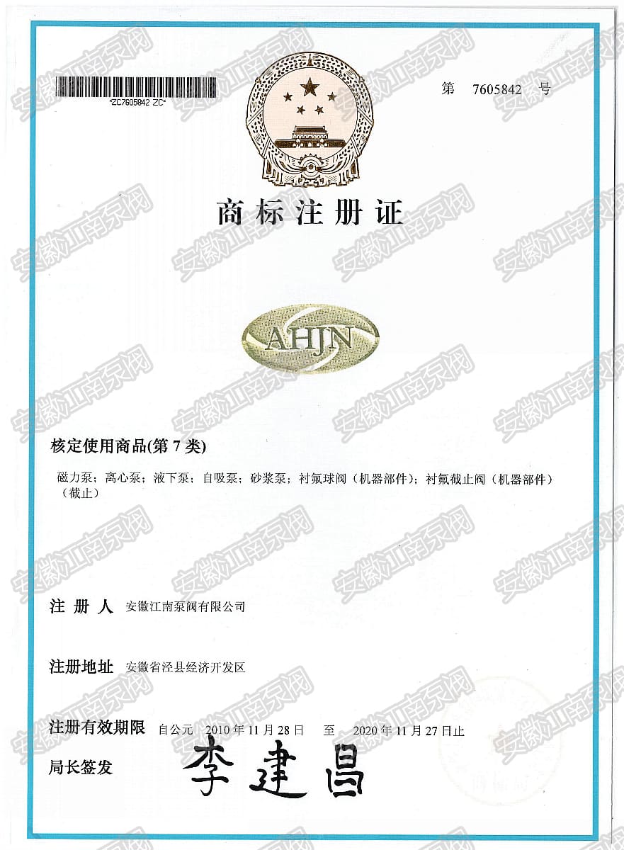 安徽江南泵閥有限公司榮獲磁力泵,離心泵,自吸泵,砂漿泵,液下泵,閥門(mén)商標(biāo)注冊(cè)證,主營(yíng):氟塑料泵,不銹鋼泵,耐腐蝕化工泵,品質(zhì)卓越,行業(yè)領(lǐng)跑企業(yè),科研生產(chǎn)型企業(yè)20年鑄就行業(yè)輝...